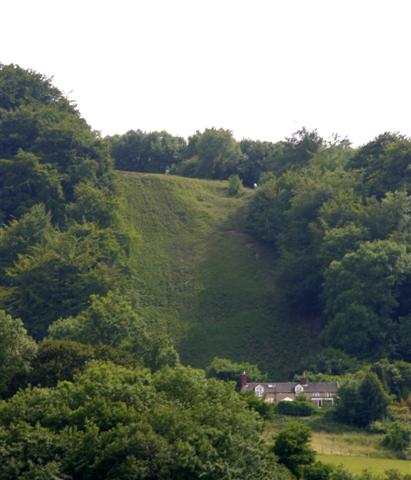 The total elevation gain (counting only the ups, and not the downs) is listed variously as between 12,000 and 14,000 feet in the north to south (Chipping Campden to Bath) direction which we took. Notable points include Cleeve Hill, the highest point in all the Cotswold range, and running UP the side of Cooper's Hill, site of the annual death-defying cheese roll. Below are pictures of Cooper's Hill as viewed from the bottom (on the left) and from the top (on the right) to give you an idea of the ascents and descents we constantly faced.