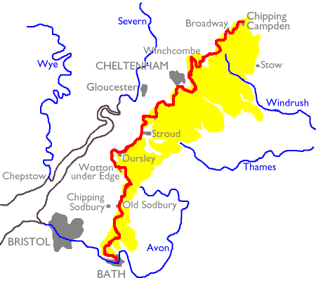 The Cotswolds technically aren't hills, but are an "escarpment" - a tilted bed of honey colored limestone nearly 100 miles in length formed during the Jurassic period almost 200 million years ago. The slope of the escarpment towards the east is gently sloping, while to the west the "scarp" side drops steeply to the plain of the Severn river. As you can see in the diagram to the right, it is along this scarp that The Cotswold Way meanders.