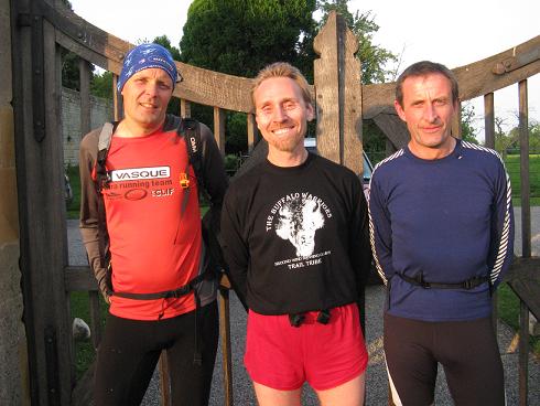 Kenny began planning the effort early in 2008 by contacting SDAC members and nearby runners to find those willing to take on the challenge and begin planning a date. Ultimately, three runners were ready, willing and able - Martin Beale, myself, and Dave Burton (pictured in that order in the picture below at the start of The Cotswold Way).